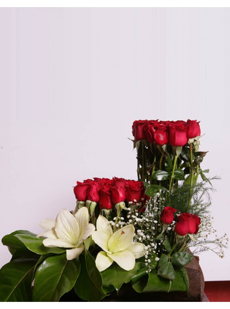 Levels of absolute beauty on a wooden base, a mixture of vibrant red and calm white. Comes with 20 Red Roses as standard with the option of adding up to 20 more.